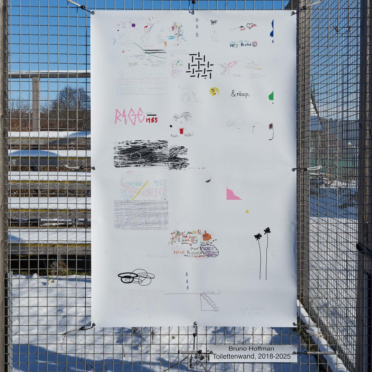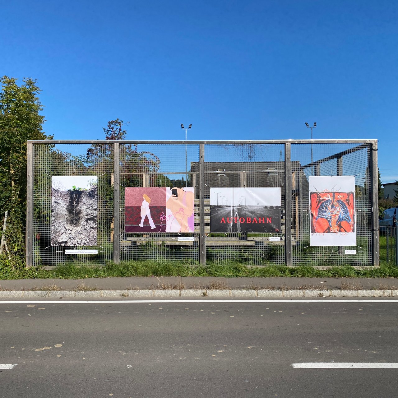 To that effect, L201 was further developed in 2022 and utilized as a venue. The thujas next to the art space were removed and replaced with a metal grid wall eight meters wide and four meters high. This wall thus becomes an advertising space or, better said, an alternative to advertising billboards on highly frequented roads. By displaying banners designed by artists, the potential of countless passing vehicles is used to convey artistic messages without having to meet capitalist demands.